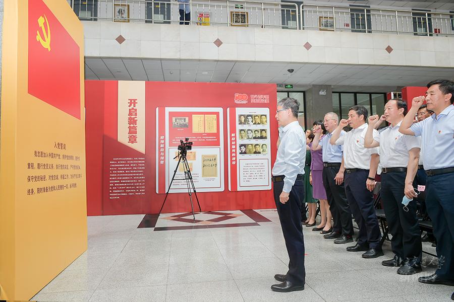 在黄泰岩的带领下,校党委中心组全体成员庄严宣誓,重温入党誓词。